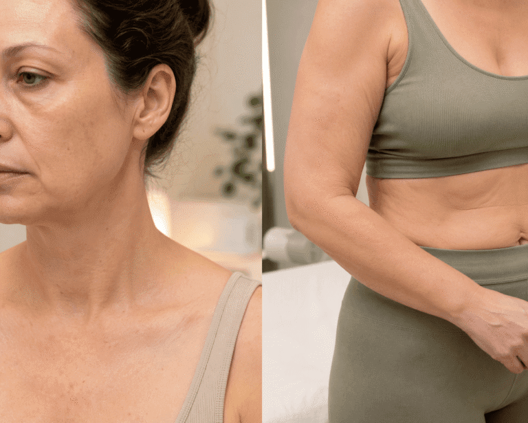La atención mediática se concentra en la cara, pero el cuerpo experimenta cambios igual de significativos. La “Ozempic body” — el término que describe la flacidez y pérdida de tono corporal después de bajar de peso con GLP-1 — afecta sobre todo estas zonas:Abdomen. La grasa abdominal se reduce, pero la piel del abdomen bajo tiene poca capacidad de retracción natural. El resultado es un abdomen más plano pero con piel sobrante que se pliega al sentarse.Brazos. La cara interna del brazo (zona tricipital) pierde grasa pero la piel queda colgando. Es una de las zonas que más preocupa a las pacientes porque es difícil de disimular con ropa.Cuello y papada. Incluso pérdidas de peso moderadas (8 a 12 kg) pueden dejar piel laxa en la zona submentoniana.Muslos internos. Similar a los brazos, la cara interna del muslo pierde volumen pero la piel no se retrae proporcionalmente.Para un análisis completo de las opciones corporales, revisa nuestra guía sobre piel flácida después de bajar de peso.
